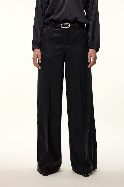 Glanzende broek van Femmes du Sud met wijde pijpen, twee steekzakken, twee paspelzakken aan de achterzijde en een ritssluiting. Materiaal: Polyester 100%