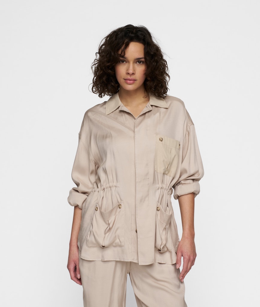 Relaxed fit safari jacket, gemaakt van glanzend viscose. Voorzien van een knoopsluiting, opgestikte zakken, pique kraag en borstzak, een verstelbare taille met trekkoorden aan de binnenzijde en een '10' monogram borduring boven de linkerzak.