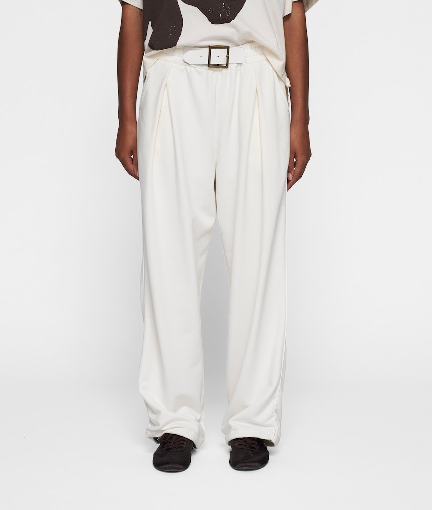 Relaxed fit wide leg jogger van 10DAYS gemaakt van zacht katoenen fleece. Voorzien van een elastische tailleband met aan de voorzijde een opgestikte ceintuur, bandplooien, schuine steekzakken, fake paspelzakken achter, satijnen biezen langs de zijnaden, een mors code boxprint bij de linkerzak, een 10DAYS patch aan de achterzijde en trekkoorden onderin de broekspijpen.