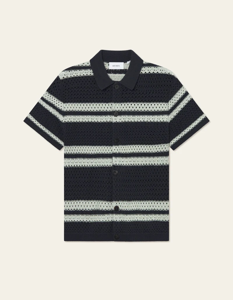 Gestreept shirt van Les Deux Copenhagen in een opengewerkt gebreid dessin met korte mouwen, kraag en een knoopsluiting.