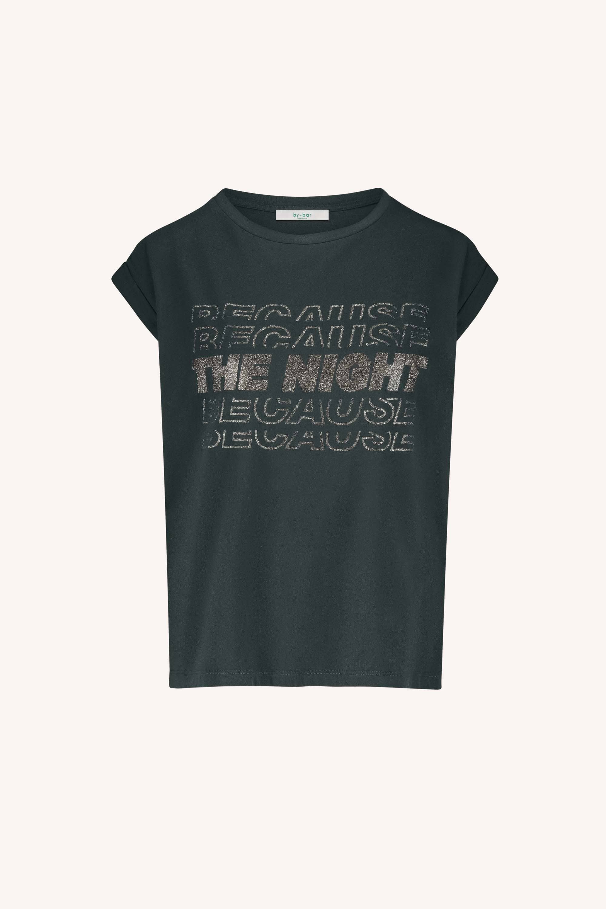 Top van By-Bar met korte aangeknipte mouwen, ronde hals en glimmende tekstprint op de borst. Materiaal: Organisch katoen 100%