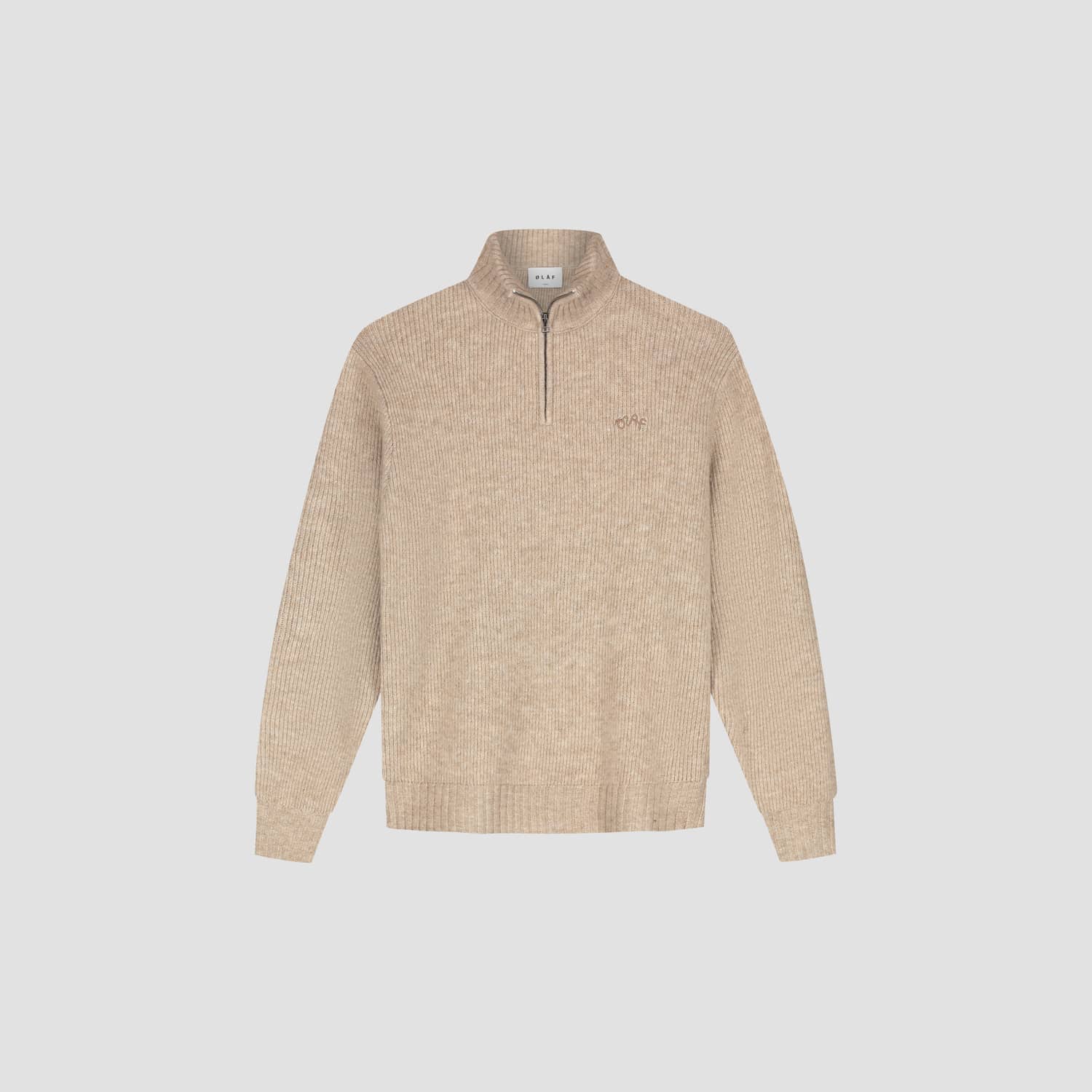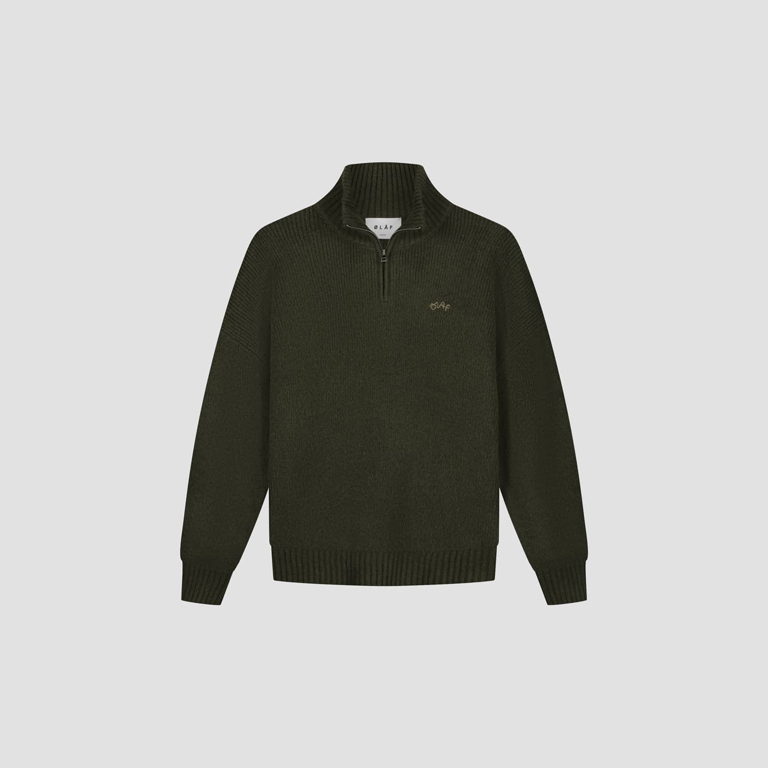Gebreide trui van Olaf met lange mouwen, opstaande kraag voorzien van korte ritssluiting, geborduurd logo op de linkerborst en ribgebreide boorden. Materiaal: Polyester 54%| acryl 38%| wol 5%| elastan 3%