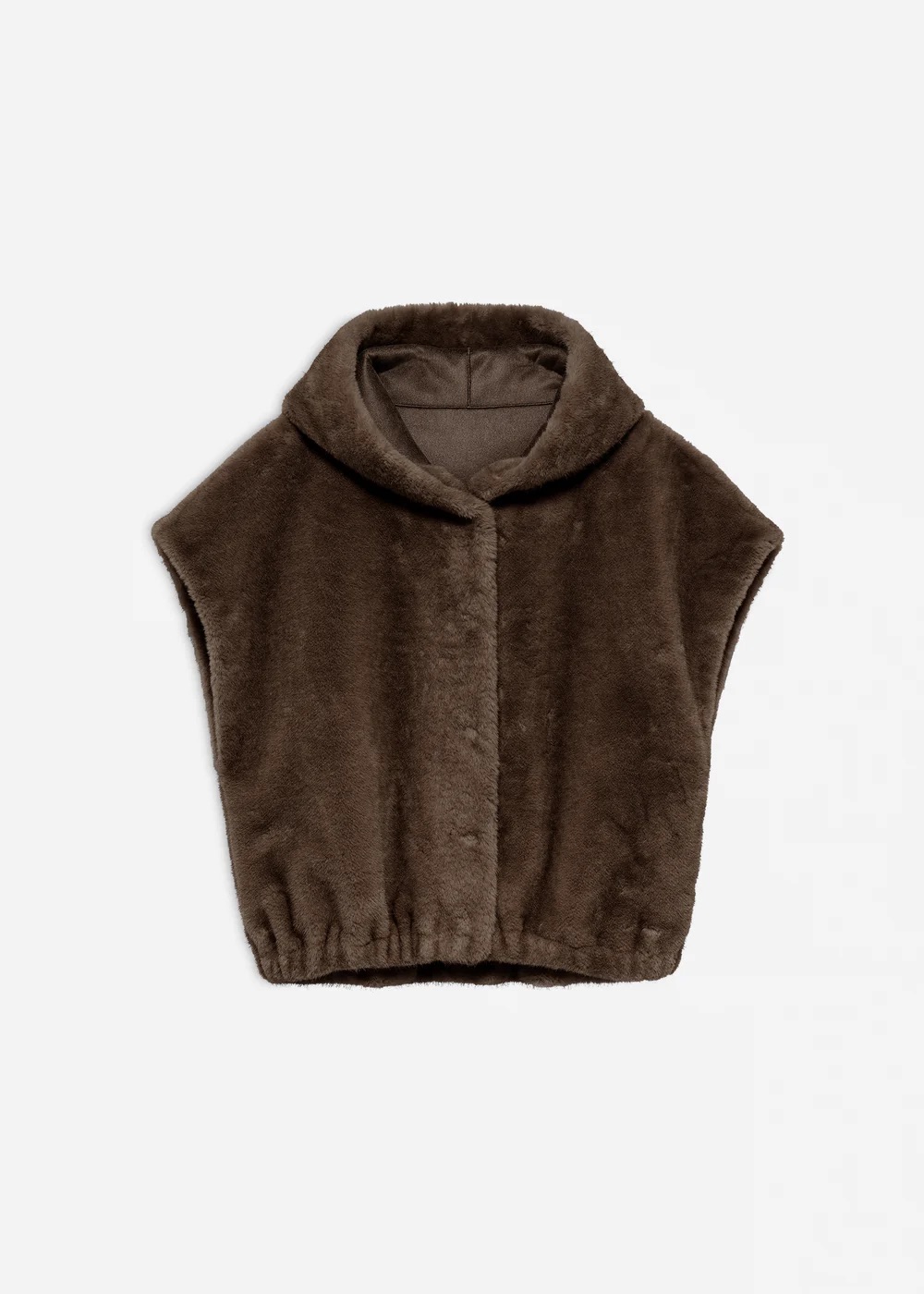 Reversible imitatiebont gilet van Studio AR met korte aangeknipte mouwen, capuchon, drukknoopsluiting, steekzakken en een elastische zoom. Materiaal: Polyester 100%