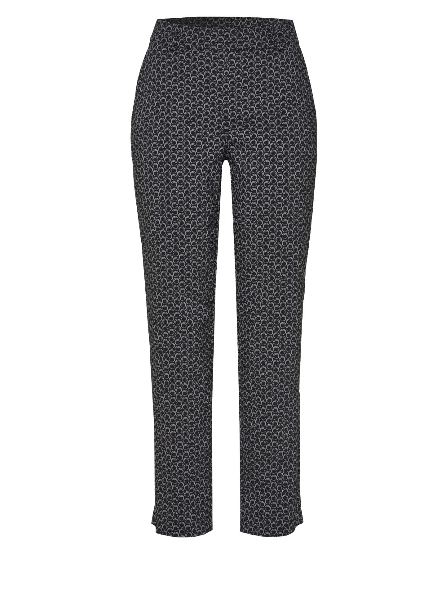 Enkellange broek van Toni in een grafisch dessin met steekzakken, twee paspelzakken aan de achterzijde, split in de pijpen en een elastische tailleband. Materiaal: Katoen 75%| polyamide 22%| elastan 3%