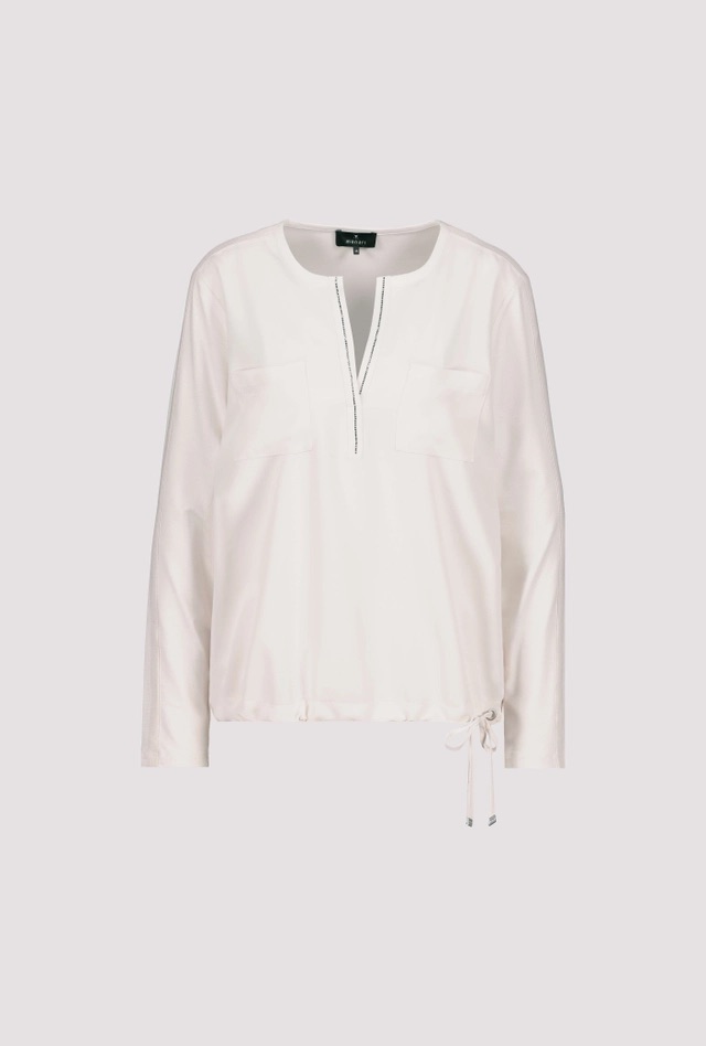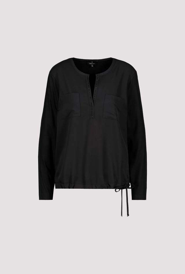 Shirtblouse van Monari met lange mouwen, ronde hals voorzien van split en strass-steentjes, twee opgestikte borstzakken en een trekkoord in de zoom. Materiaal: Viscose 92%| elastan 8%