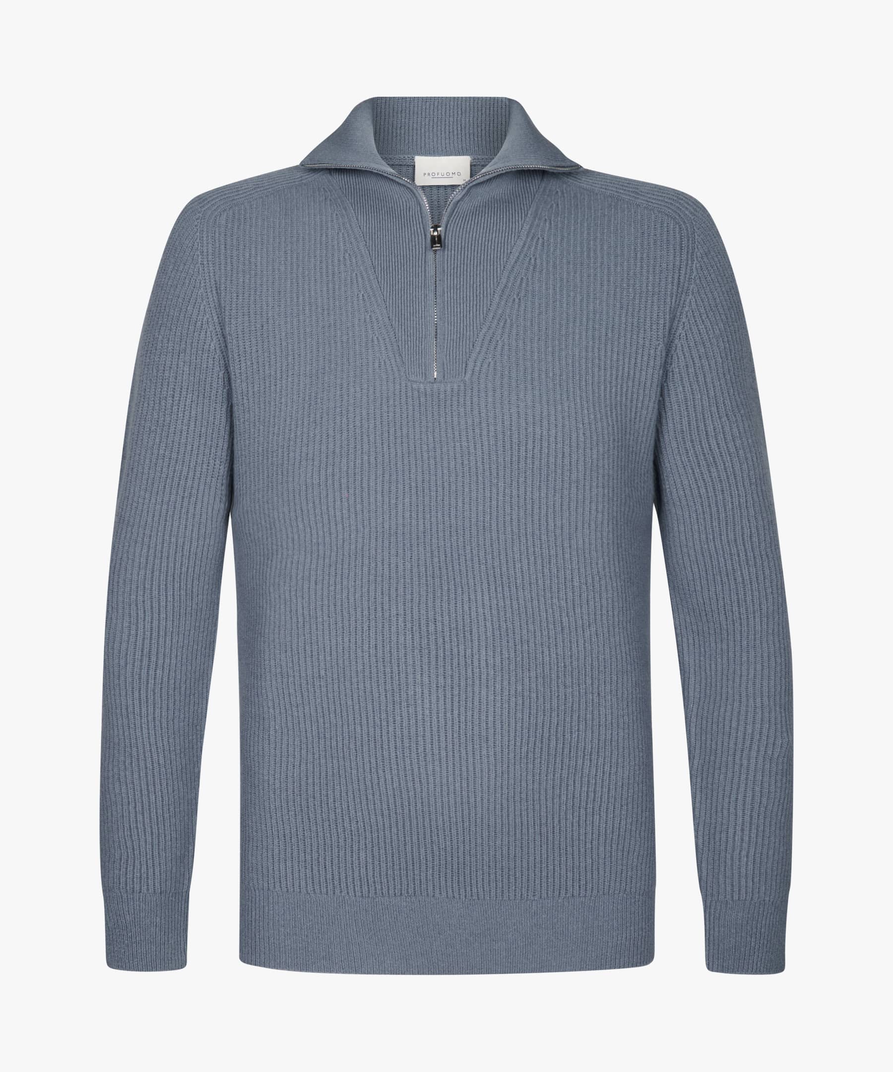 Gebreide trui van Profuomo in ribstructuur met lange mouwen en opstaande kraag voorzien van ritssluiting. Materiaal: Wol 100%