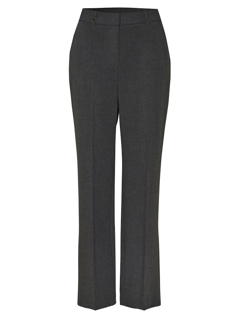 Gemêleerde broek van Toni met rechte pijpen, verborgen knoop- en ritssluiting, steekzakken, twee paspelzakken en een elastische tailleband aan de achterzijde.