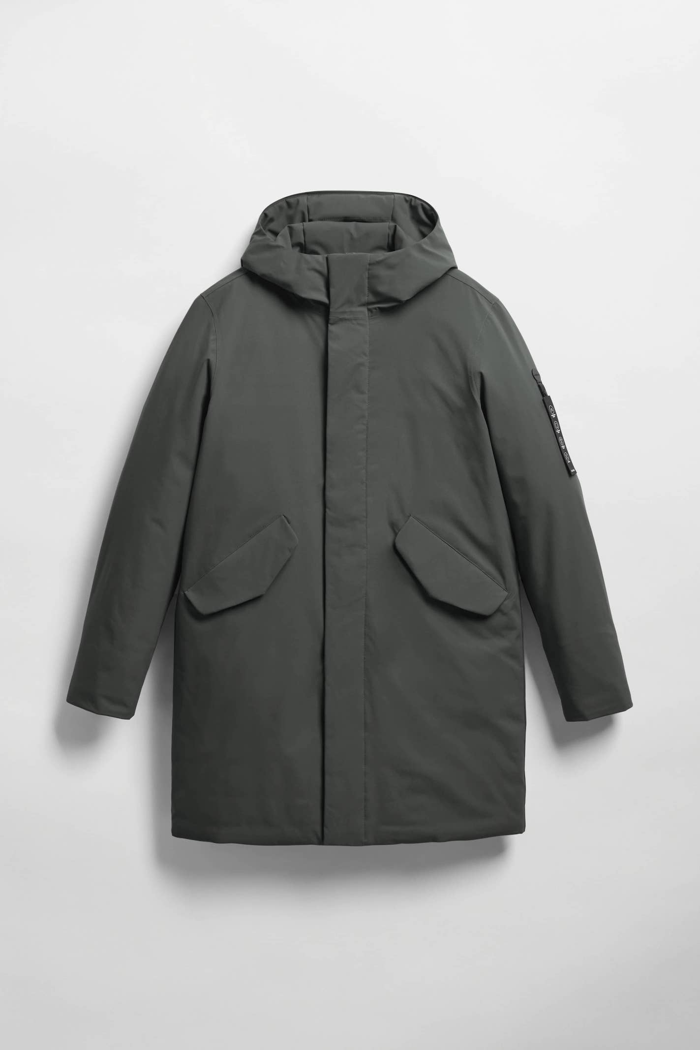Waterafstotende jas van Elvine met een verborgen deelbare ritssluiting, magneetknopen, capuchon, ribgebreide manchetten en twee klepzakken.