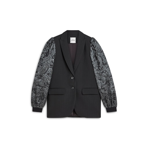 Krijtstreep blazer van Summum met jacquard lange pofmouwen, reverskraag, knoopsluiting en twee klepzakken.