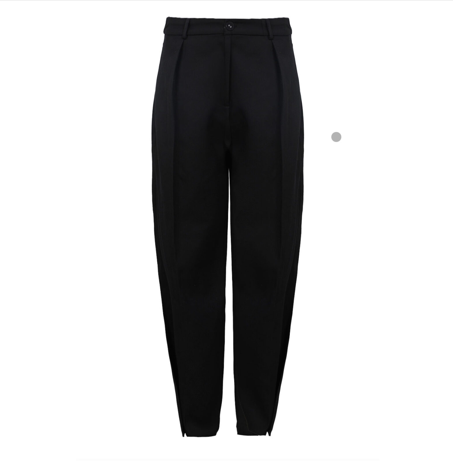 Barrel broek van Est'seven uit de Ellemieke Vermolen collectie met een knoop- en ritssuiting, wijde pijpen voorzien van knopen aan de onderzijden, twee steekzakken en twee fake achterzakken.