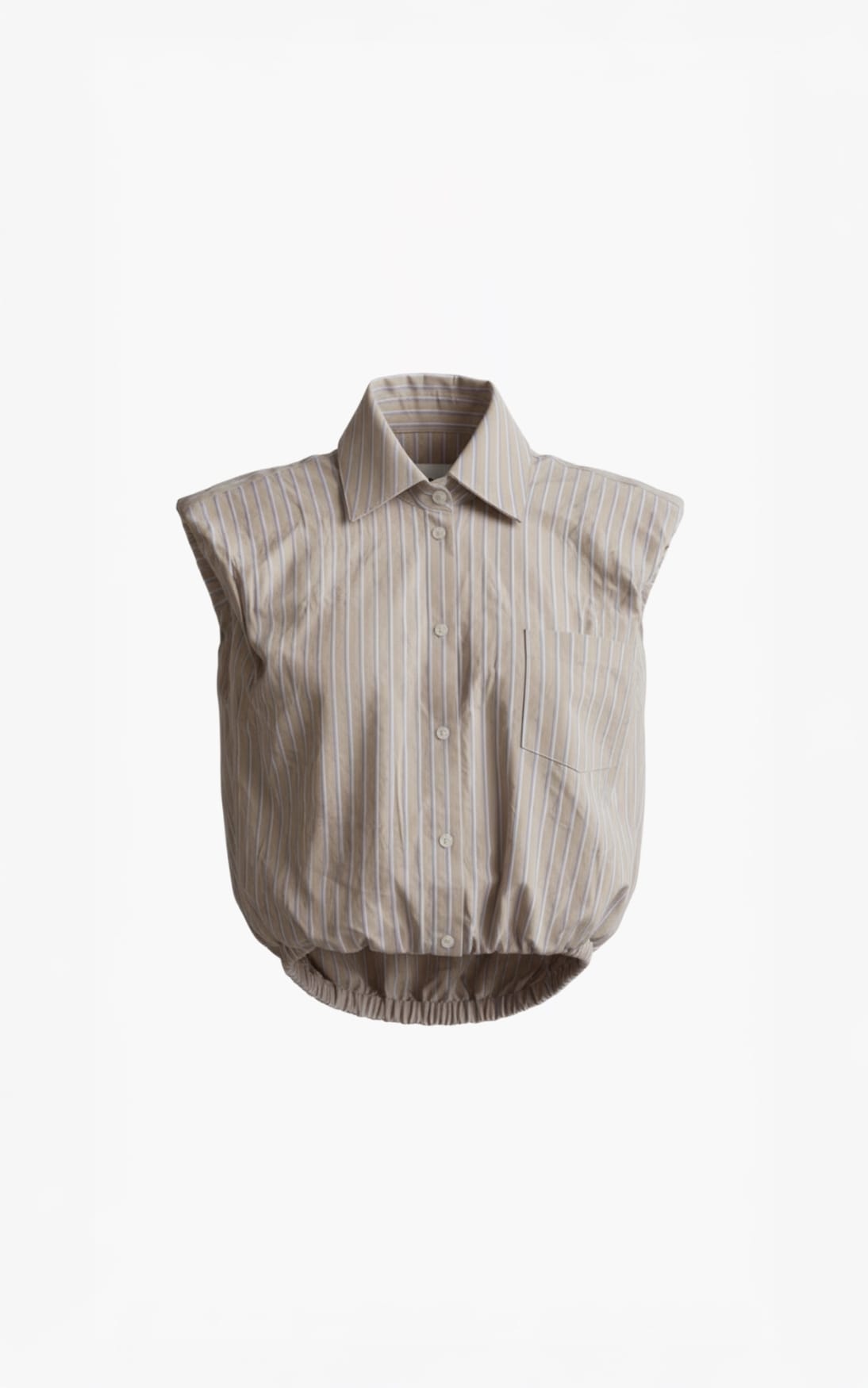 Mouwloze, gestreepte blouse van Aimée the Label met schoudervullingen, kraag, knoopsluiting, opgestikte borstzak en elastische taille.