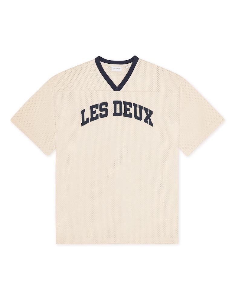 Mesh shirt van Les Deux Copenhagen met een boxy fit, korte mouwen, V-hals voorzien van contrasterende boord en logo op de voorzijde.