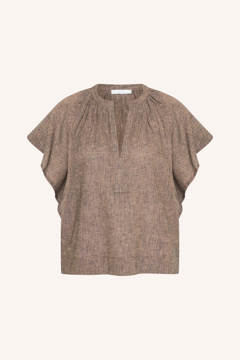 Lurex blouse van By-Bar met korte mouwen en ronde hals voorzien van V-uitsnede. Materiaal: Katoen 78%| linnen 20%| lurex 2%
