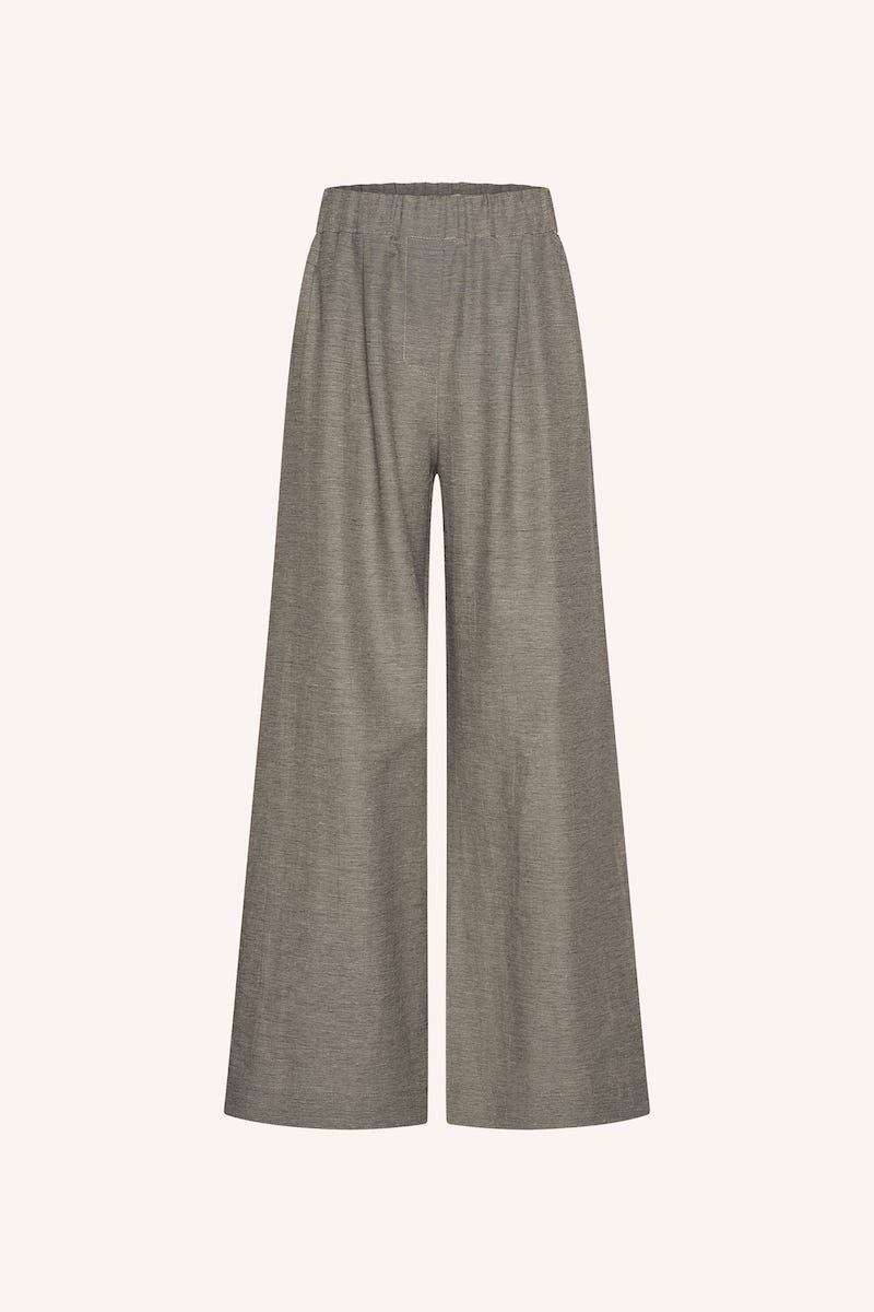 Gemêleerde broek van By-Bar met wijde pijpen, elastische tailleband en steekzakken. Materiaal: Polyester 45%| katoen 34%| linnen 16%| overige 5%