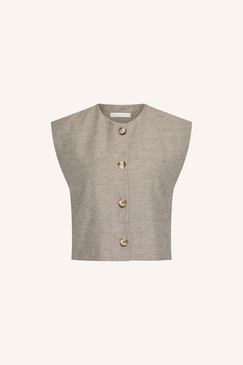 Gemêleerd gilet van By-Bar met een ronde hals en knoopsluiting. Materiaal: Polyester 45%| katoen 34%| linnen 16%| overig 5%