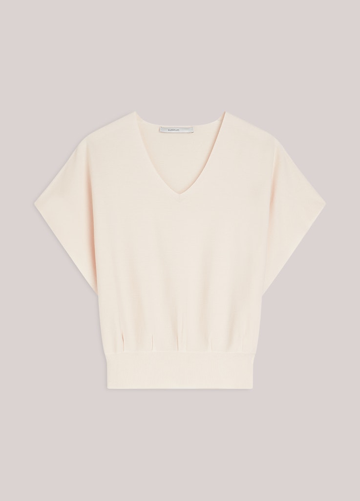 Naadloze, gebreide top van Summum met een fijne ribbelsteekpatroon, korte mouwen, V-hals en geplooide zoom.
