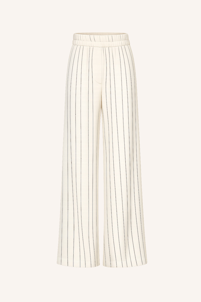 Krijtstreep broek van By-bar met wijde pijpen, hoge taille, steekzakken en een elastische tailleband. Materiaal: Viscose 70%| linnen 30%