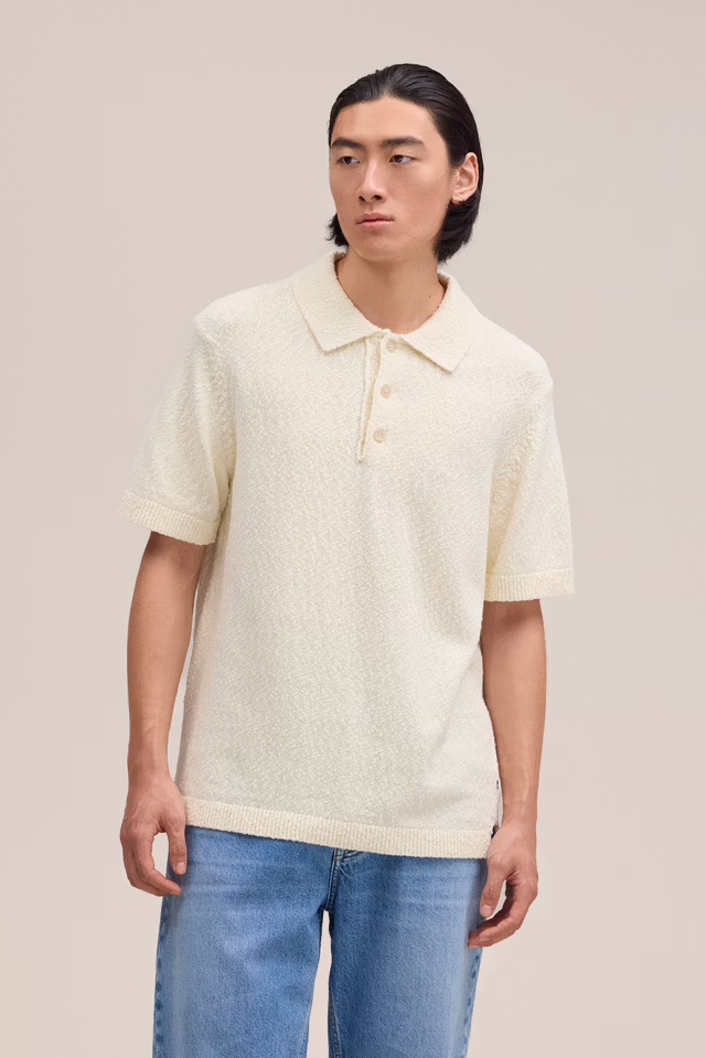 Bouclé poloshirt van NN07 vervaardigd van zacht katoengaren, afgewerkt met parelmoeren knopen en een fijne ribboord langs de manchetten en onderzoom. Voorzien van korte mouwen en zijsplitten.