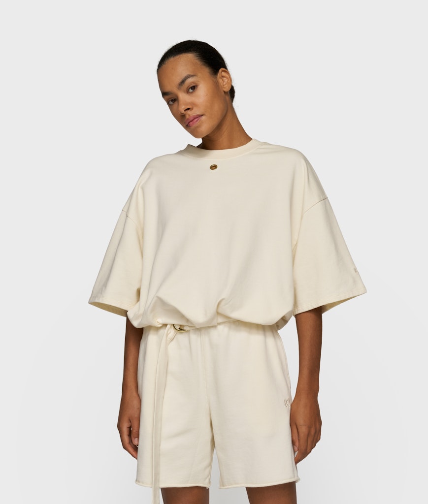 Relaxed fit balloon sweater van 10DAYS gemaakt van zacht GOTS-gecertificeerd biologisch katoen. Voorzien van korte mouwen, een ronde hals met ribboord, een metalen oogje bij de hals en een ‘10’ monogram borduring op de linkermouw. De zoom is afgewerkt met plooien en elastiek aan de binnenzijde voor het ballon-effect. Materiaal: Organic katoen 95%| elastan 5%