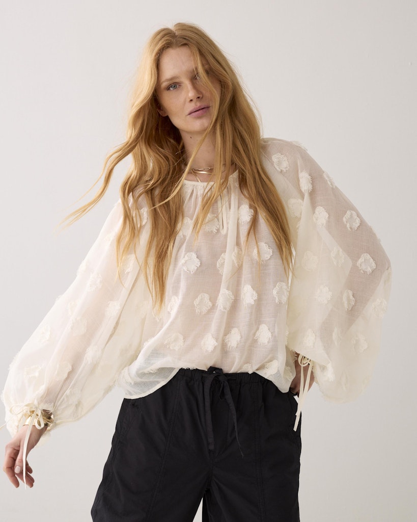 Semi-transparante blouse van Summum met een 3D bloemen print, lange raglanmouwen voorzien van strikdetail aan de manchetten en een ronde hals met split en striksluiting.