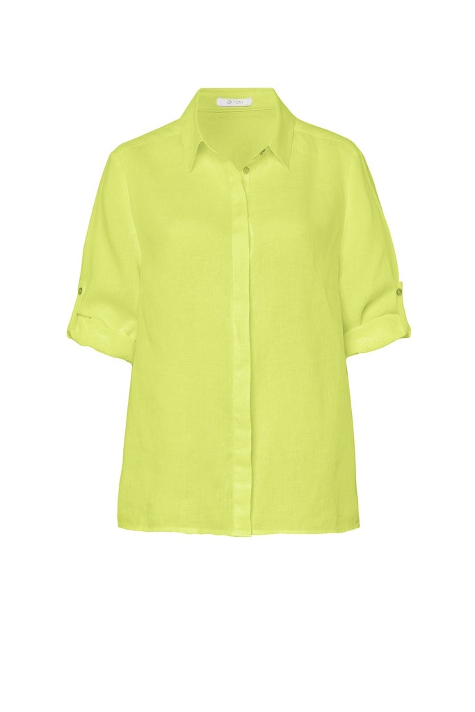 Linnen blouse van Toni met driekwart hold-up mouwen, kraag en een verborgen knoopsluiting. Materiaal: Linnen 100%