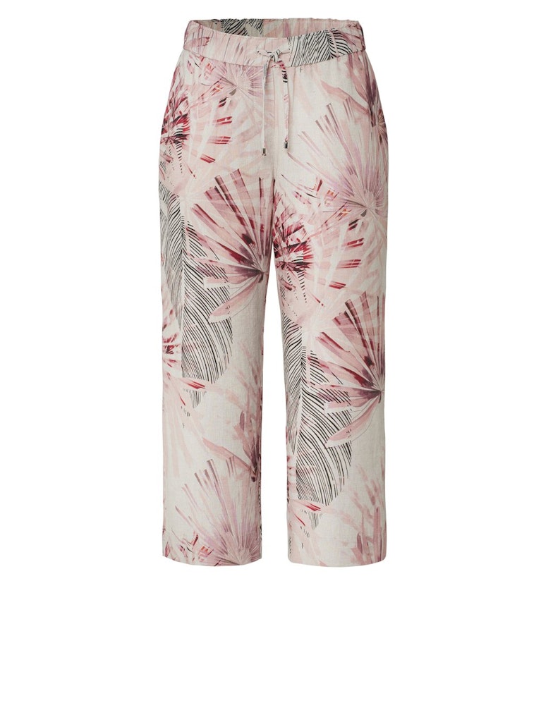 Enkellange linnen broek van Toni in een all-over dessin met steekzakken en een elastische tailleband voorzien van trekkoord. Materiaal: Linnen 100%