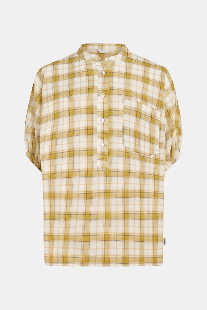 Geruite blouse van Penn & Ink met korte pofmouwen, opstaande kraag, halve knoopsluiting en een opgestikte borstzak. Materiaal: Katoen 99%| elastan 1%