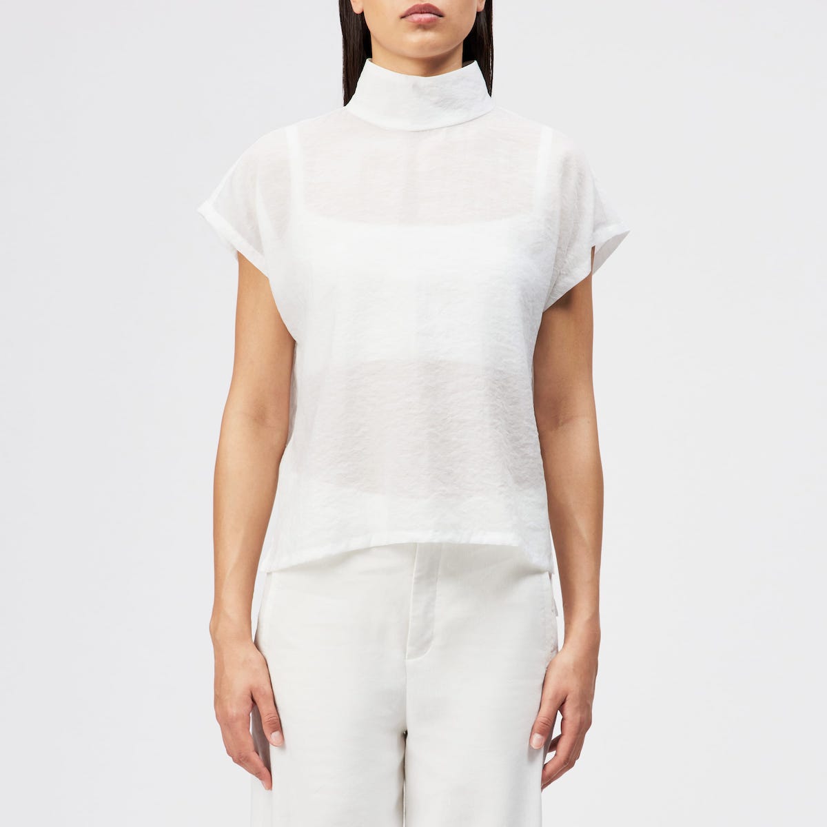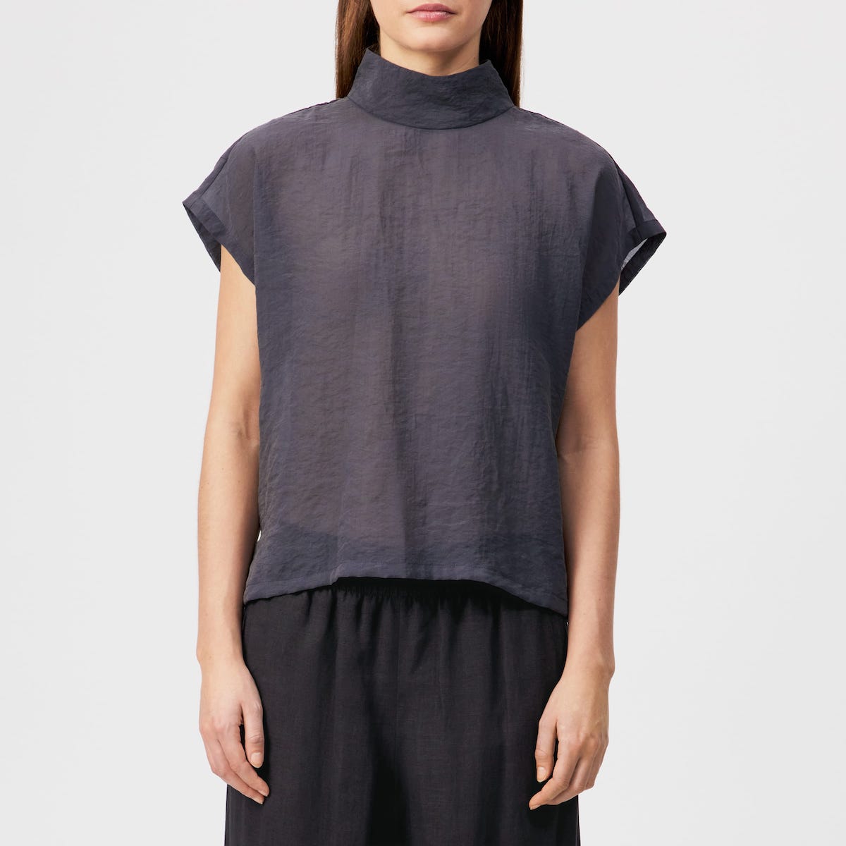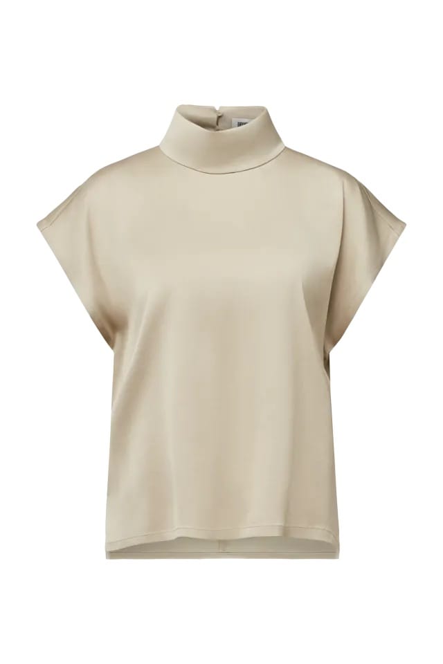 Satijnen H-lijn top van Drykorn met dropped shoulders, turtleneck, split in de zijnaad en een uitsnede met knoopsluiting aan de achterzijde.