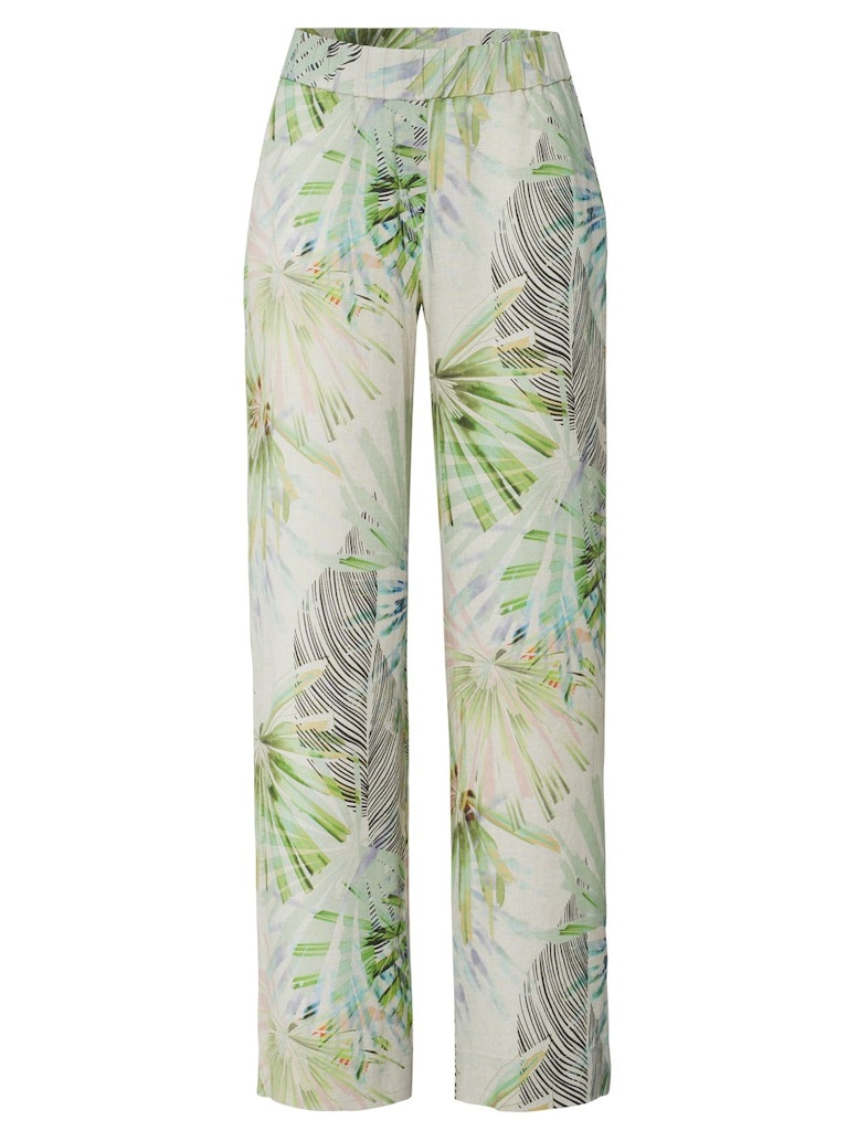 Linnen broek van Toni in een bladeren print met een elastische tailleband. Materiaal: Linnen 100%