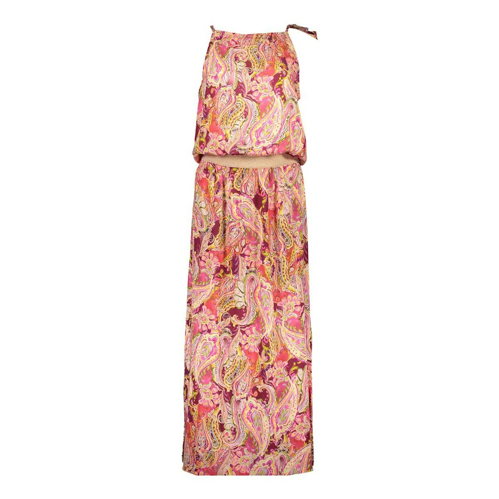 Halterjurk van Geisha in een paisley dessin met een hoge ronde hals voorzien van striksluiting, elastische tailleband en een split in de zijnaden.