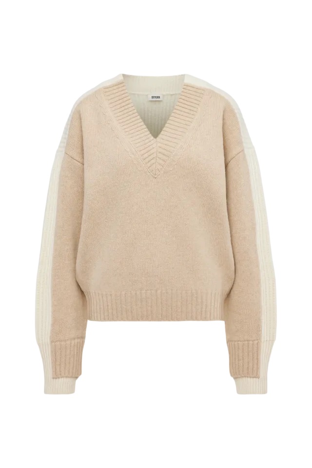 Oversized trui van Drykorn in tweekleurig patchwork met lange mouwen, verlaagde schoudernaden, diepe V-hals en brede ribboorden.