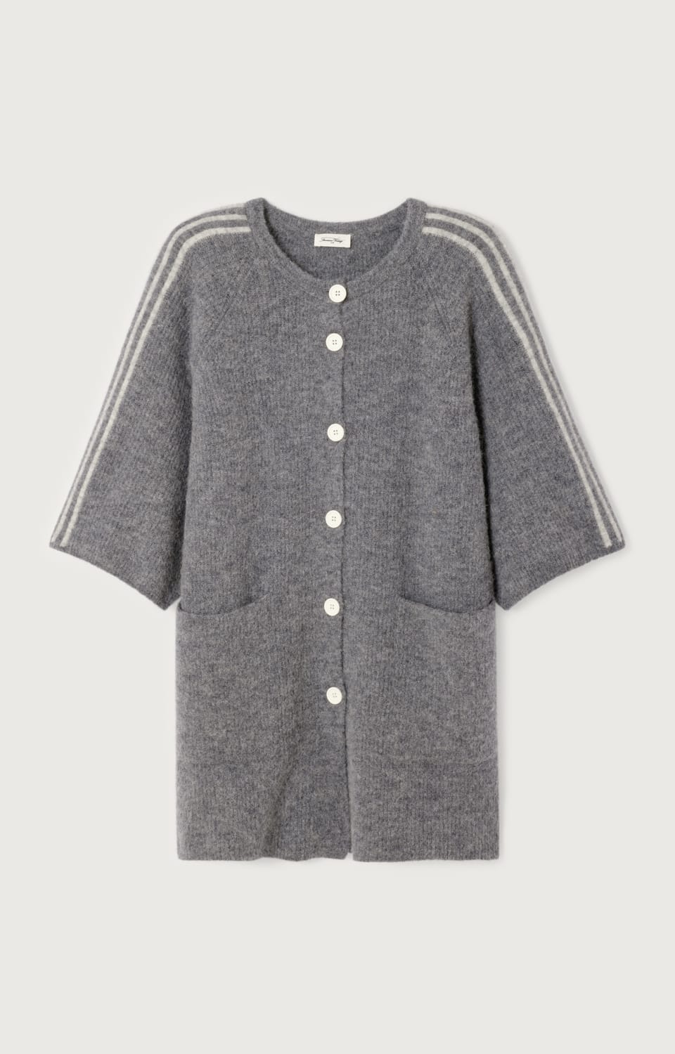 Gemêleerd lang vest van American Vintage met driekwart wijde mouwen voorzien van contrasterende strepen, ronde hals, knoopsluiting en twee opgestikte zakken. Materiaal: Alpaca 34%| wol 34%| polyamide 29%| elastan 3%