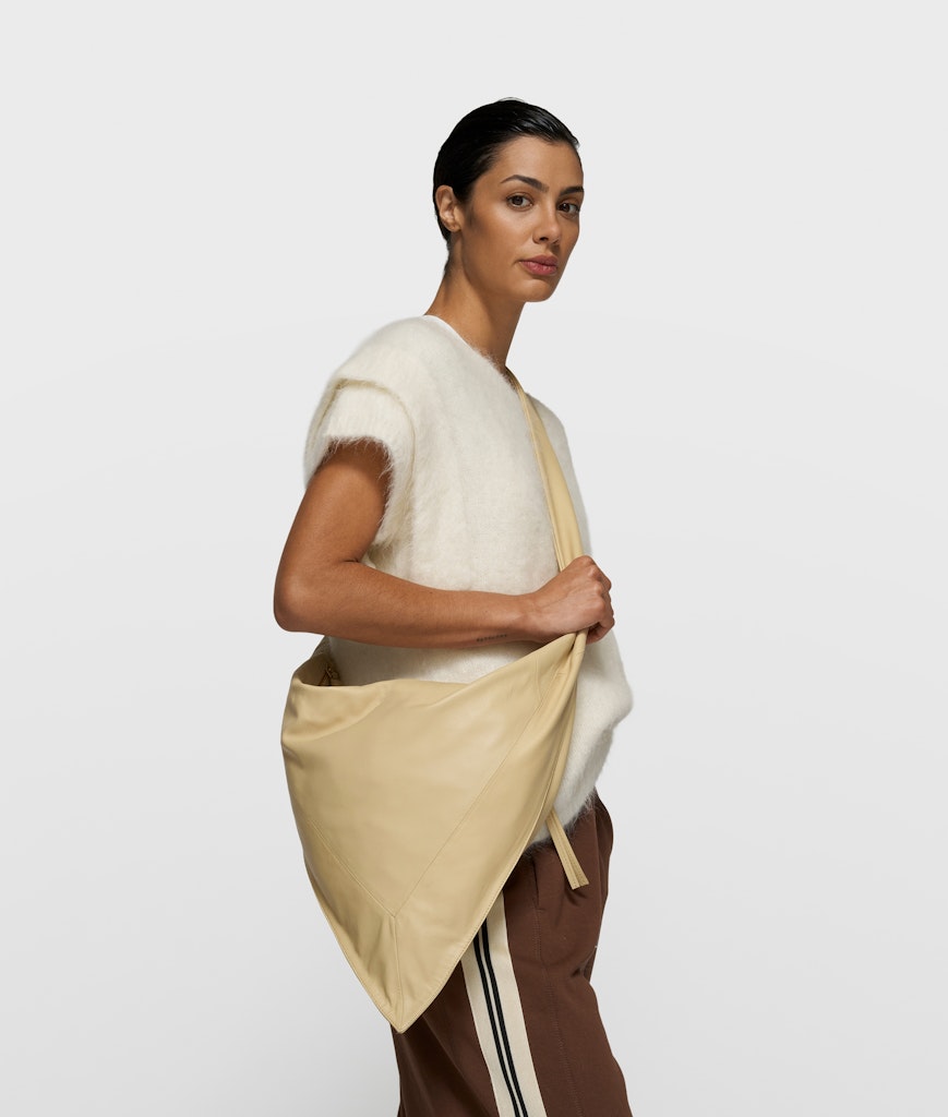 Leren schoudertas van 10DAYS in driehoekvorm, gemaakt van schapenleer met katoenen voering. Voorzien van een ritssluiting, verstelbare schouderband en een buitenvakje met rits. Afmeting schouderband: 130 cm. Afmeting: 40 x 46 cm.