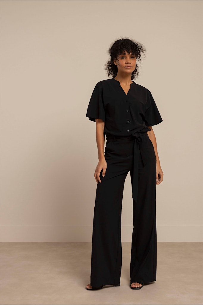 Maggie jumpsuit van Studio Anneloes in travel kwaliteit met halflange mouwen, knoopsluiting, V-hals, wijde pijpen, strikceintuur in de taille, steekzakken en faux paspelzakken aan de achterzijde. Materiaal: Polyamide 75%| elastan 25%