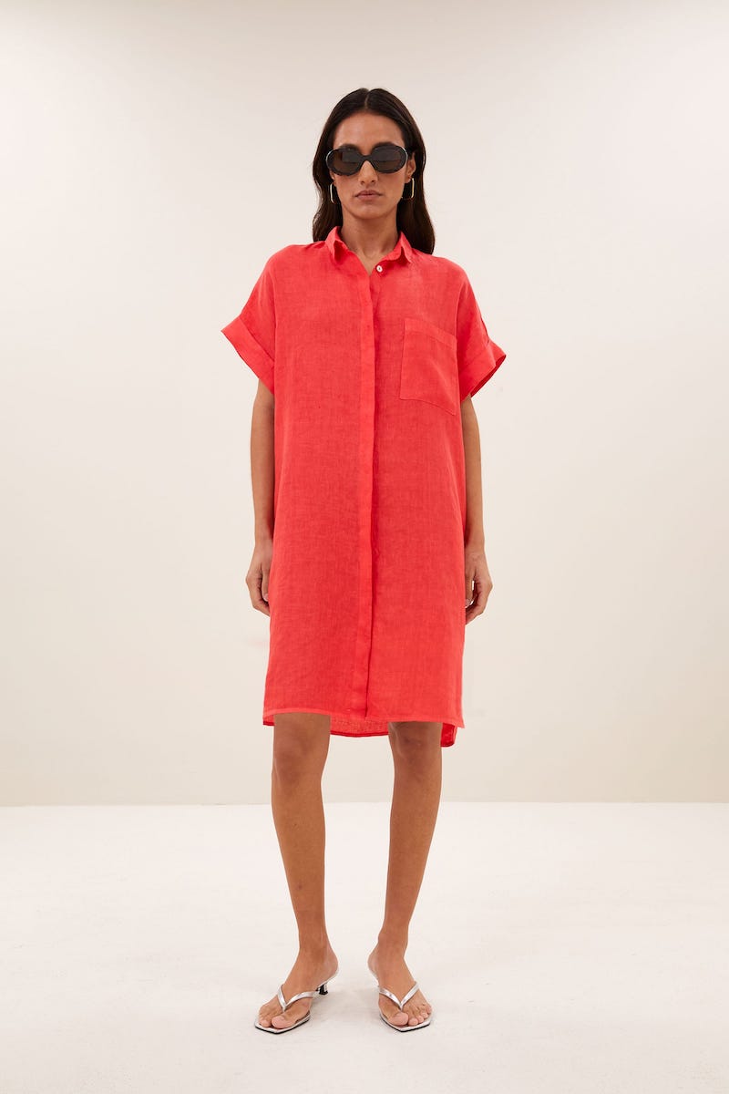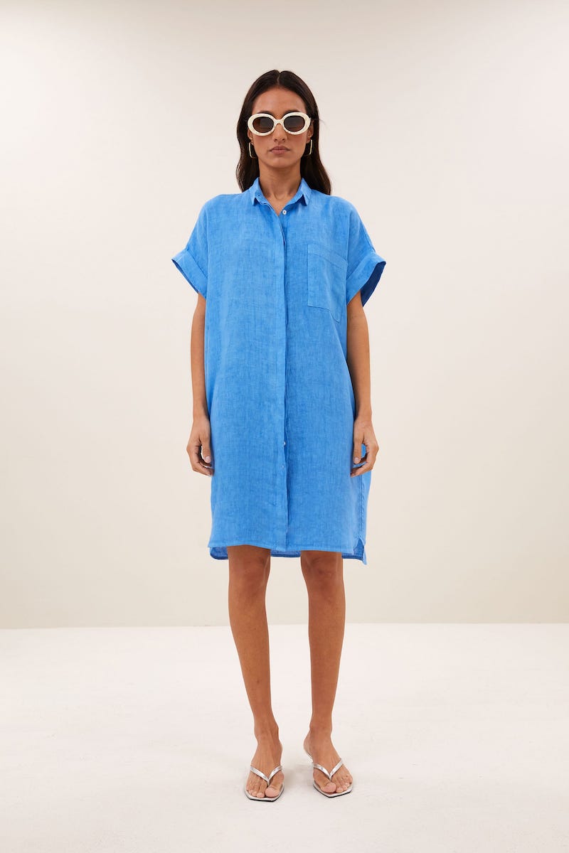 Linnen jurk van By-Bar met korte aangeknipte mouwen voorzien van omslag, kraag, verborgen knoopsluiting, opgestikte borstzak en een afgeronde zoom.