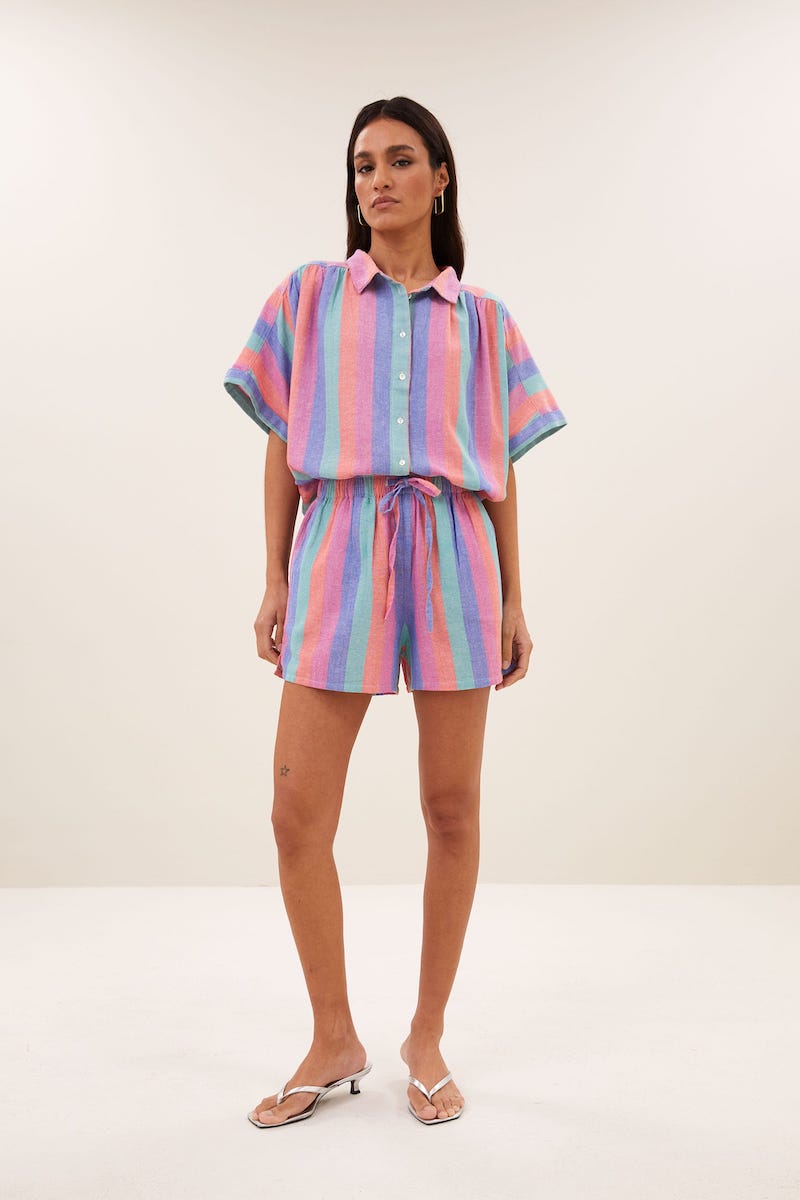 Multicolor gestreepte short van By-Bar met steekzakken en een elastische tailleband voorzien van trekkoord. Materiaal: Organisch katoen 100%